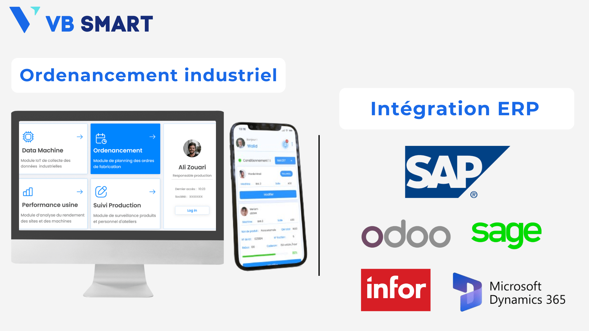 VB SMART propose la collecte des données machine et logiciels ERP pour rendre vos plannings de fabrication fiable, concret et réel en reliant la disponibilité de vos machines aux détails du produit que vous souhaitez fabriquer