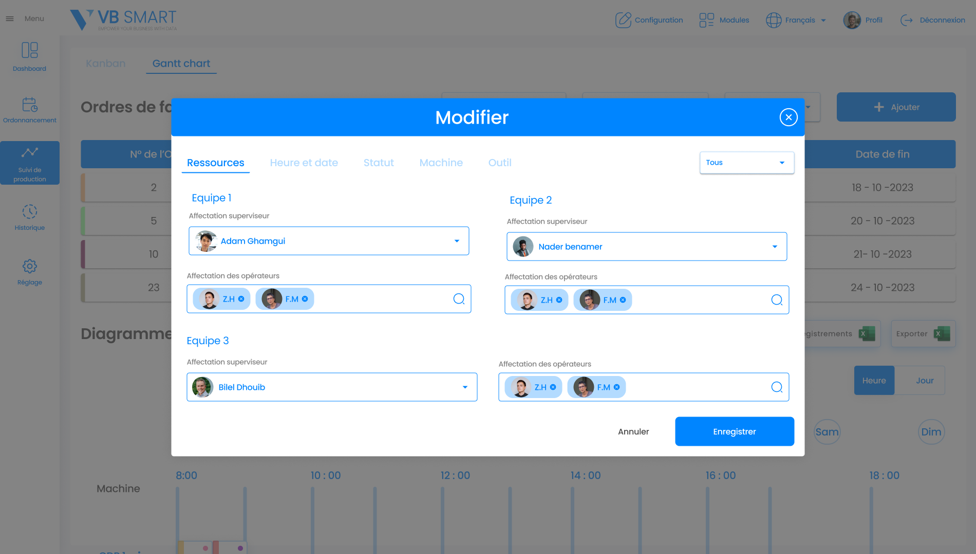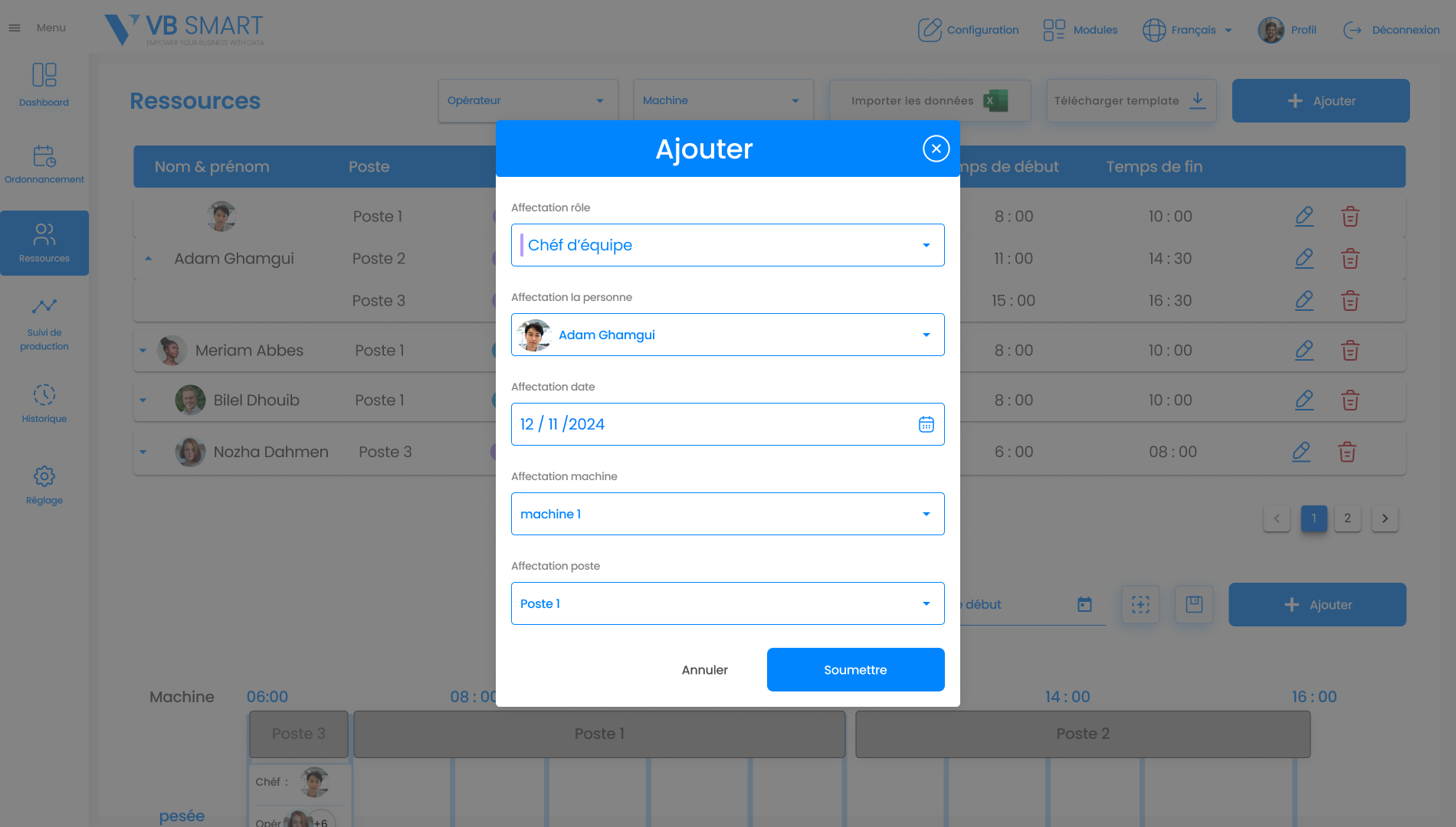 Dans la section ressources, après la section ordonnancement, qui concerne la configuration des machines et la nomenclature des produits, le planificateur clique sur le bouton “Ajouter” pour affecter l’ordre de fabrication au chef d’équipe, en renseignant les donnĂ©es d’affectation telles que la date du ticket, la machine concernĂ©e pour cette tâche, ainsi que le poste de production oĂą cette tâche sera effectuĂ©e