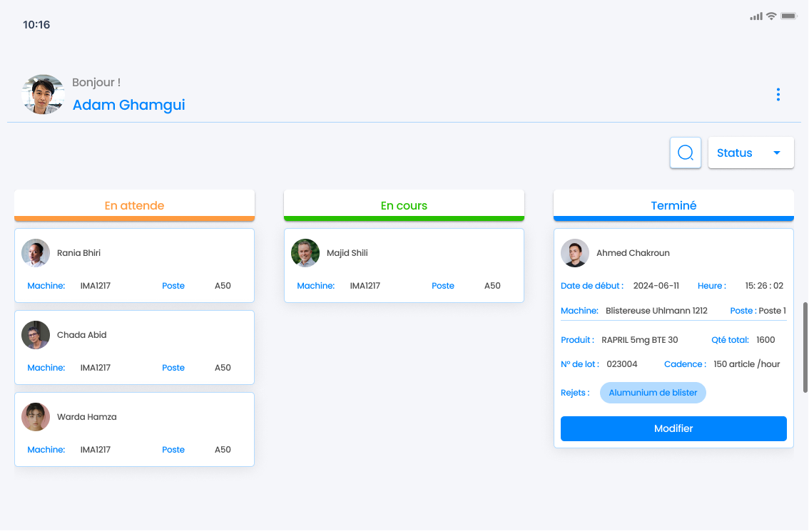 Au moment où l’ordre de fabrication est confirmé par le planificateur, le chef d’équipe se connecte à son interface, présentée sous forme de tableau Kanban affichant le statut de chaque opérateur et présentant les tâches selon leur progression : en attente, en cours ou terminées