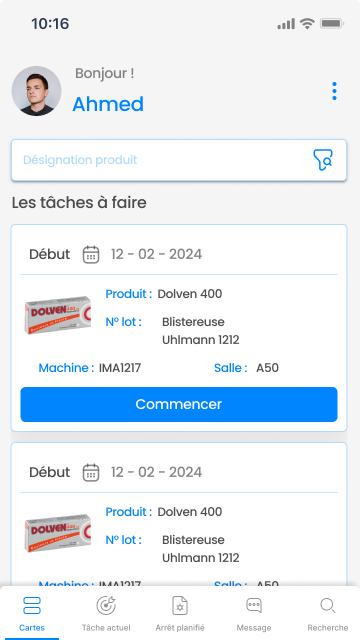 Lorsqu’un opĂ©rateur accède Ă son environnement, il reçoit la liste des produits Ă fabriquer. Il suffit de cliquer sur le bouton “commencer” pour lancer la production.