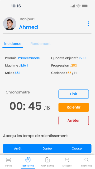 Pour chaque tâche, le chef d’équipe dispose d’informations clés comme la date et l’heure de début, la machine utilisée, le poste de production, le produit fabriqué, la quantité réalisée, ainsi que les rejets éventuels