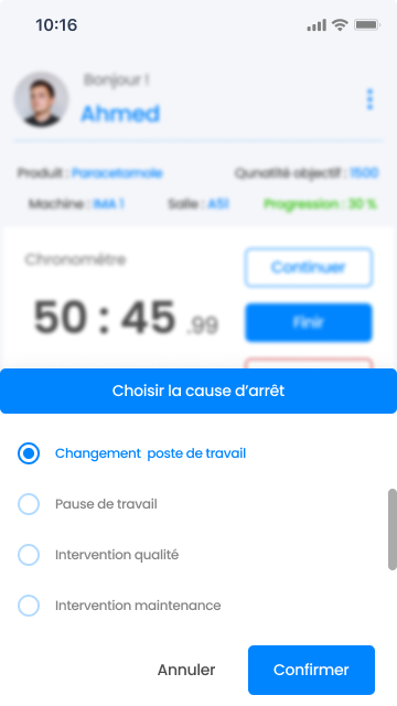 Pour les arrĂŞts ou les ralentissements, l’opĂ©rateur ne saisit rien manuellement, mais choisit la cause dans une liste prĂ©dĂ©finie par le planificateur. Cette mĂ©thode simplifie la tâche et rĂ©duit les erreurs.